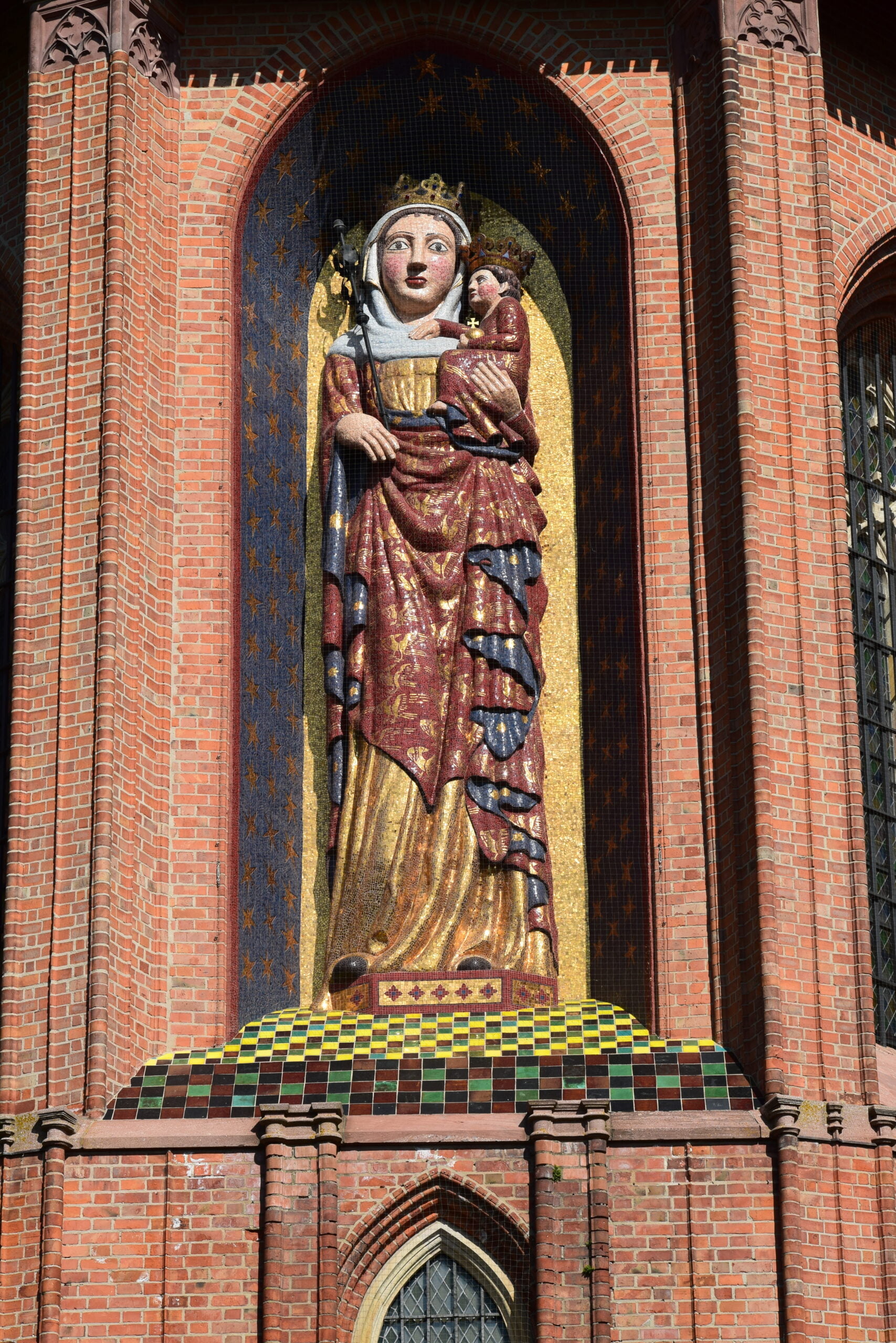 Powstała w 1340 roku i od tego czasu przez ponad 600 lat zdobiła zamek krzyżacki. Podczas II wojny światowej uległa całkowitemu zniszczeniu. Pieczołowicie wyszukane i zebrane z gruzów wojennych fragmenty kolorowego szkła, które tworzyły szatę Madonny, udało się ocalić, aby z czasem odbudować monument. Zbiórka środków na odbudowę zajęła wiele lat. Figura Madonny została odtworzona, w 60 % z oryginalnych elementów. W kwietniu 2016 roku powróciła na swoje miejsce i od tamtej pory na nowo zachwyca swoim majestatem. Pokryta przez ponad 300 tysięcy mozaikowych elementów, najpiękniej wygląda w promieniach słońca, roztaczając swój świetlisty, wielobarwny urok.